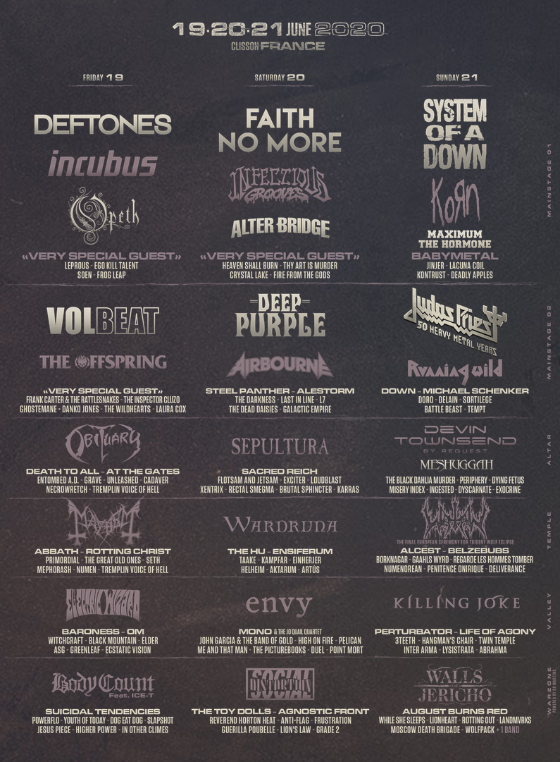 Vrijdag 19 Juni staan onder meer Deftones, Volbeat, Obituary, Mayhem, Electric Wizzard & Body Count. Zaterdag hebben we dan weer Faith No More, Deep Purple, Sepultura, Wardruna, Envy en Social Distortion. En de zondag? De zondag hebben we onder meer System Of A Down, Judas Priest, Devin Townsend, Watain, Killing Joke en Walls Of Jericho.